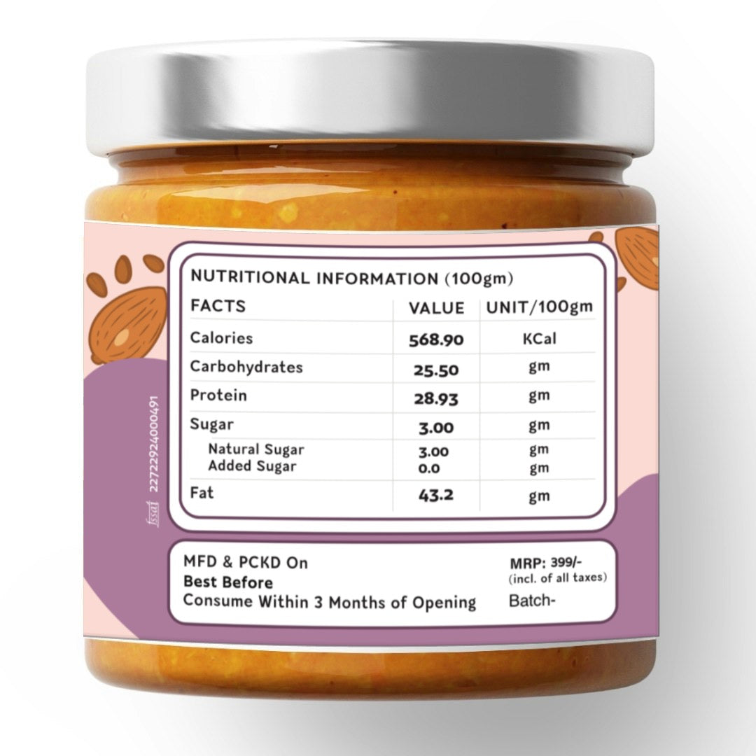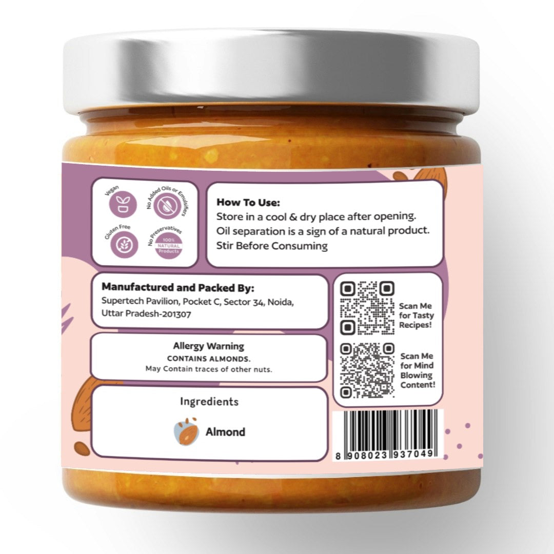 Pure hand picked roasted almonds and nothing else, a perfect nut butter for a healthy diet. There are no added artificial flavours or sweeteners or preservatives. A vegan product that can be used with smoothies, toasts, oats, fruits, and anything you love!ย